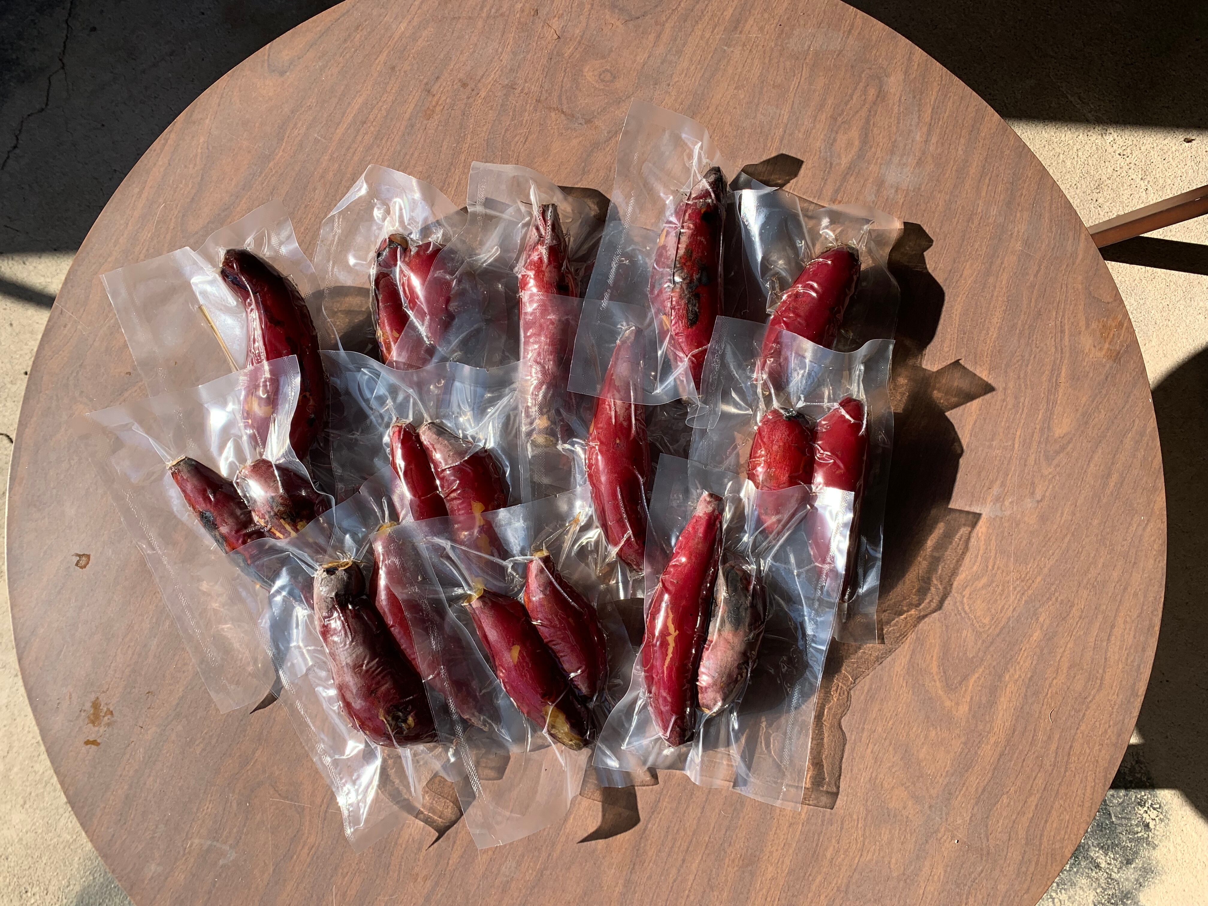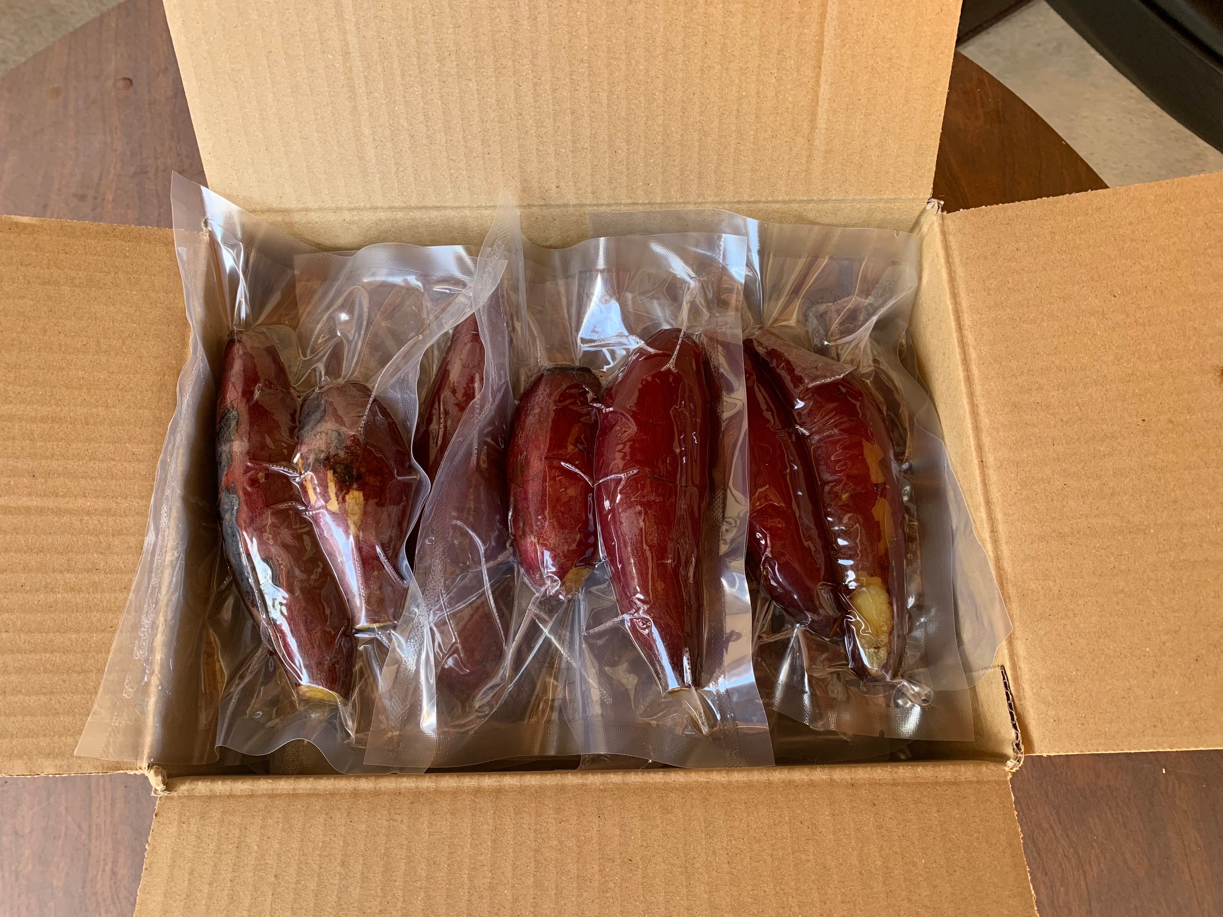 1つ150g〜200gくらいの小さなお芋(食べきりサイズ)を1つもしくは2つを真空パックにしています。合計2kgで内容は15個〜18個くらい(1つのお芋の大きさにより個数は変動します)になります。